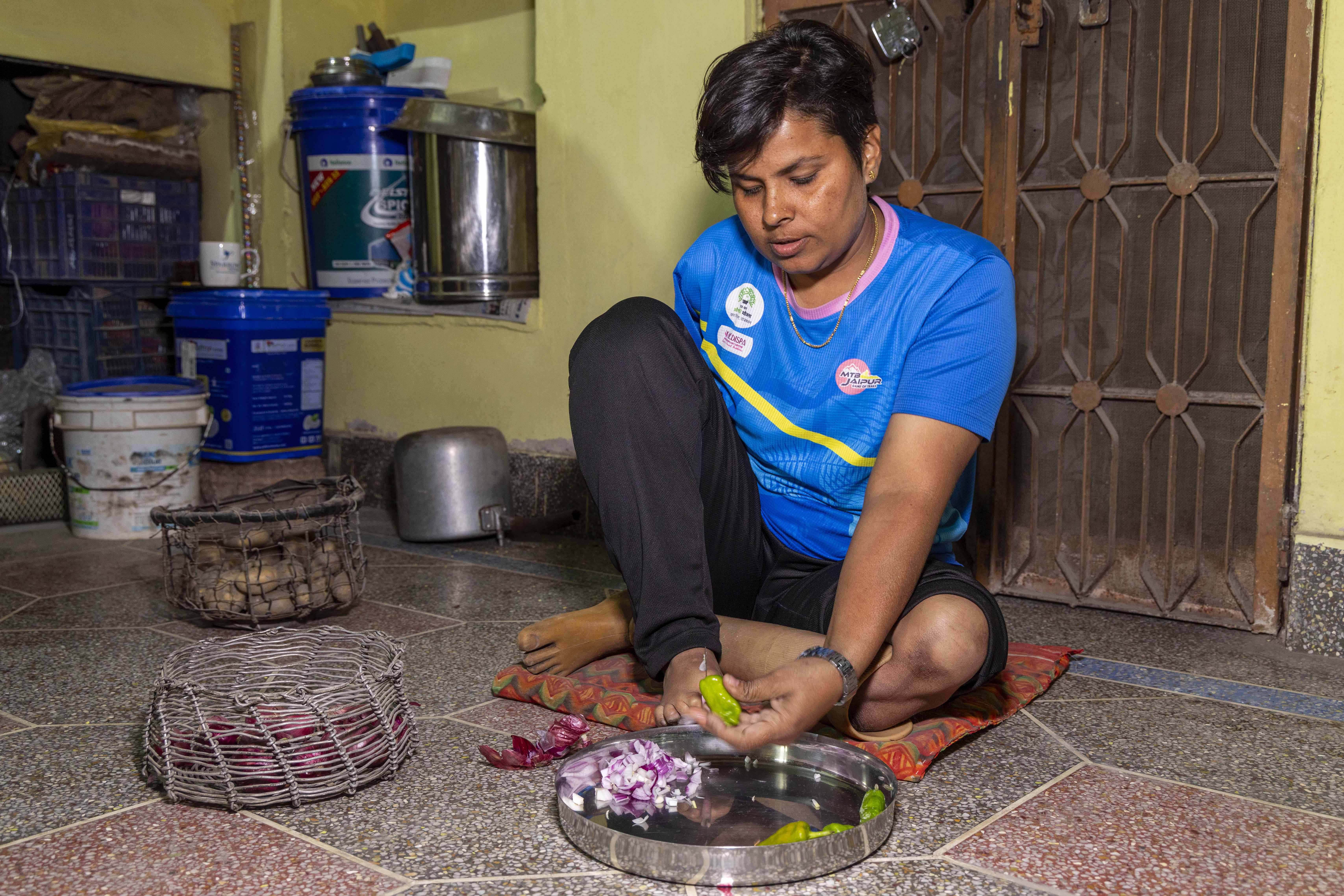 Sangeeta cooks with ease, rolling chapatis, chopping vegetables, wearing a watch single‑handedly, making everyday tasks look effortless. Her favourite foods are bajre ki roti, bitter gourd, dal‑baati, sangri ki sabzi. She says, “There is no point in brooding. When you see people who have even less than you, you realise how blessed you are.”
